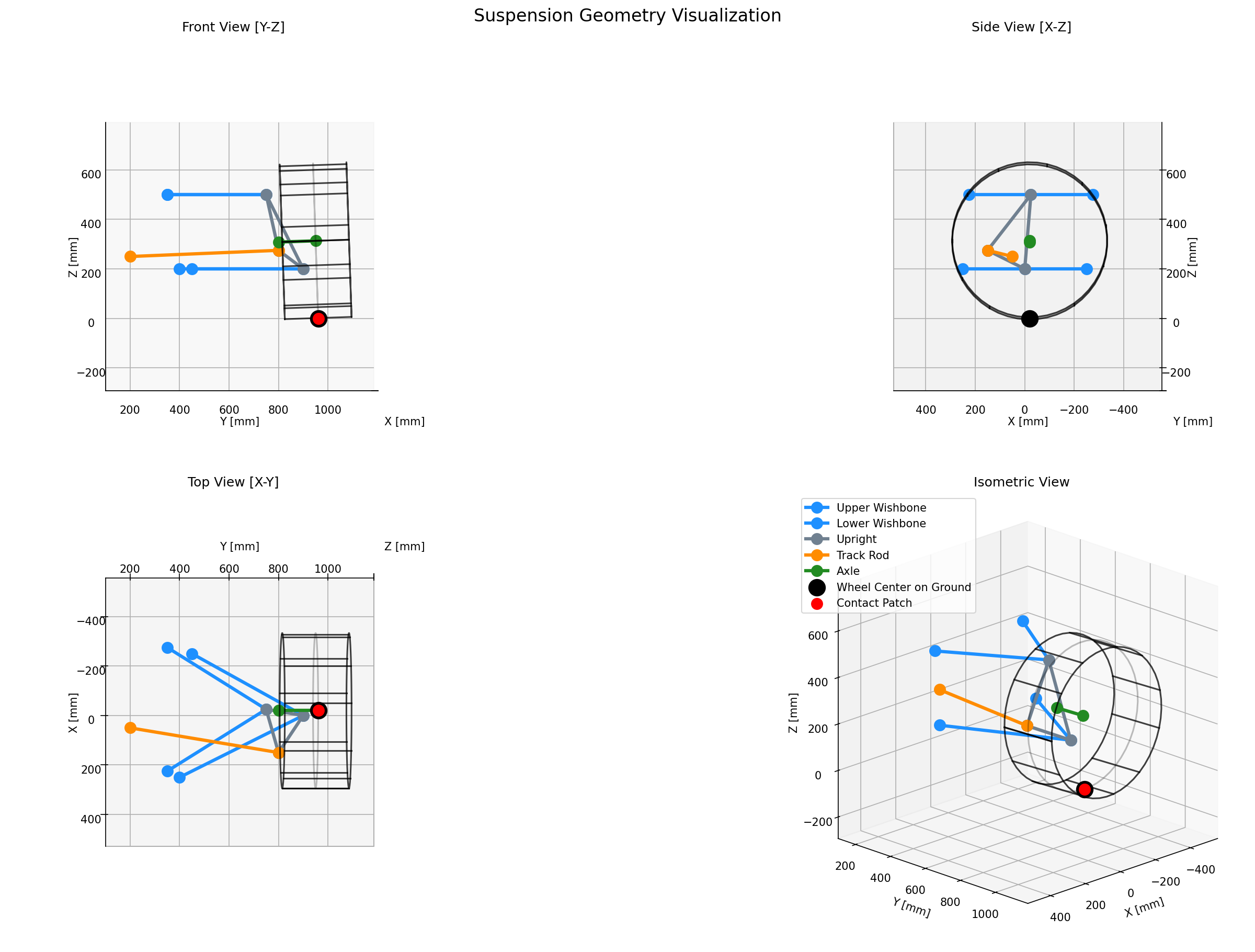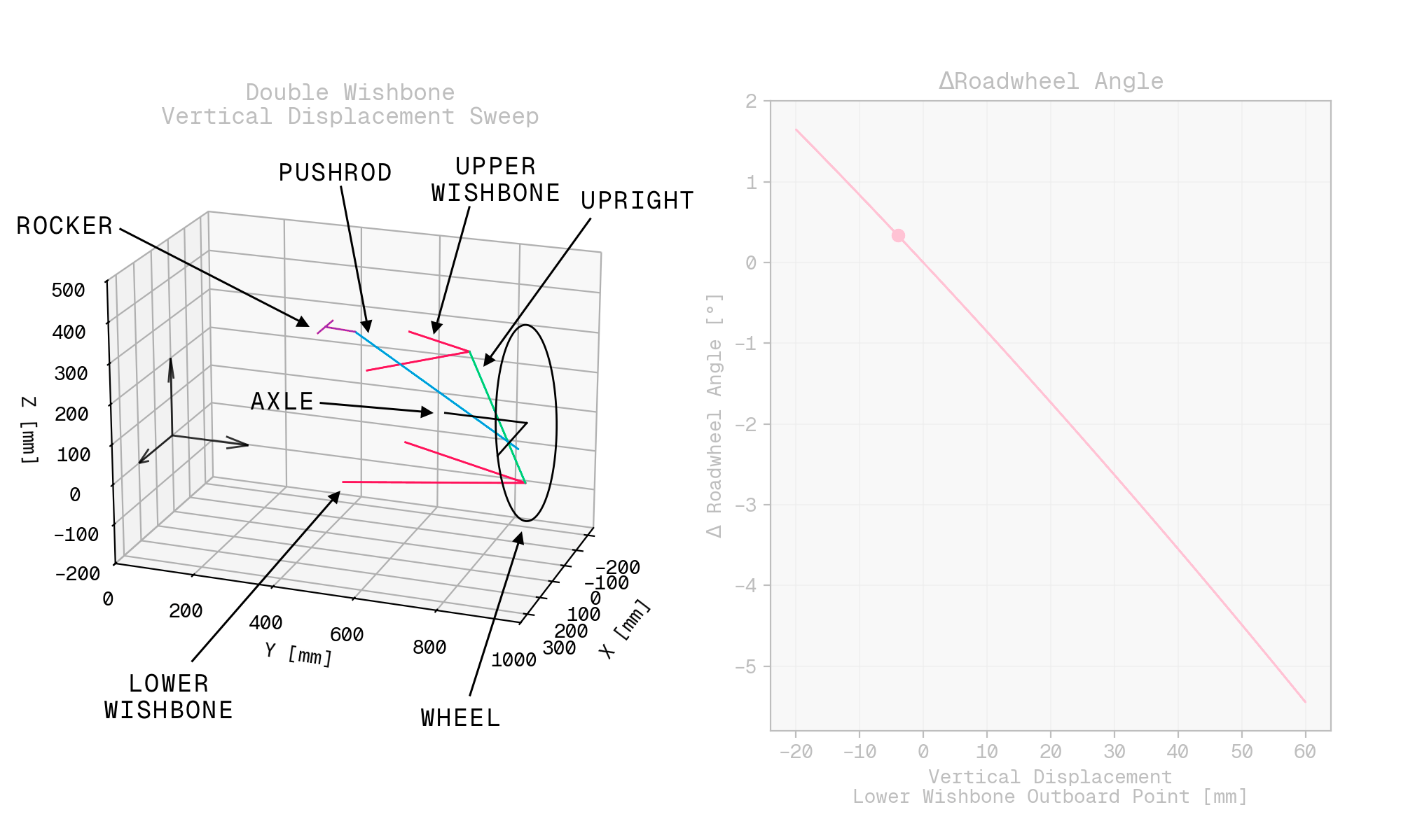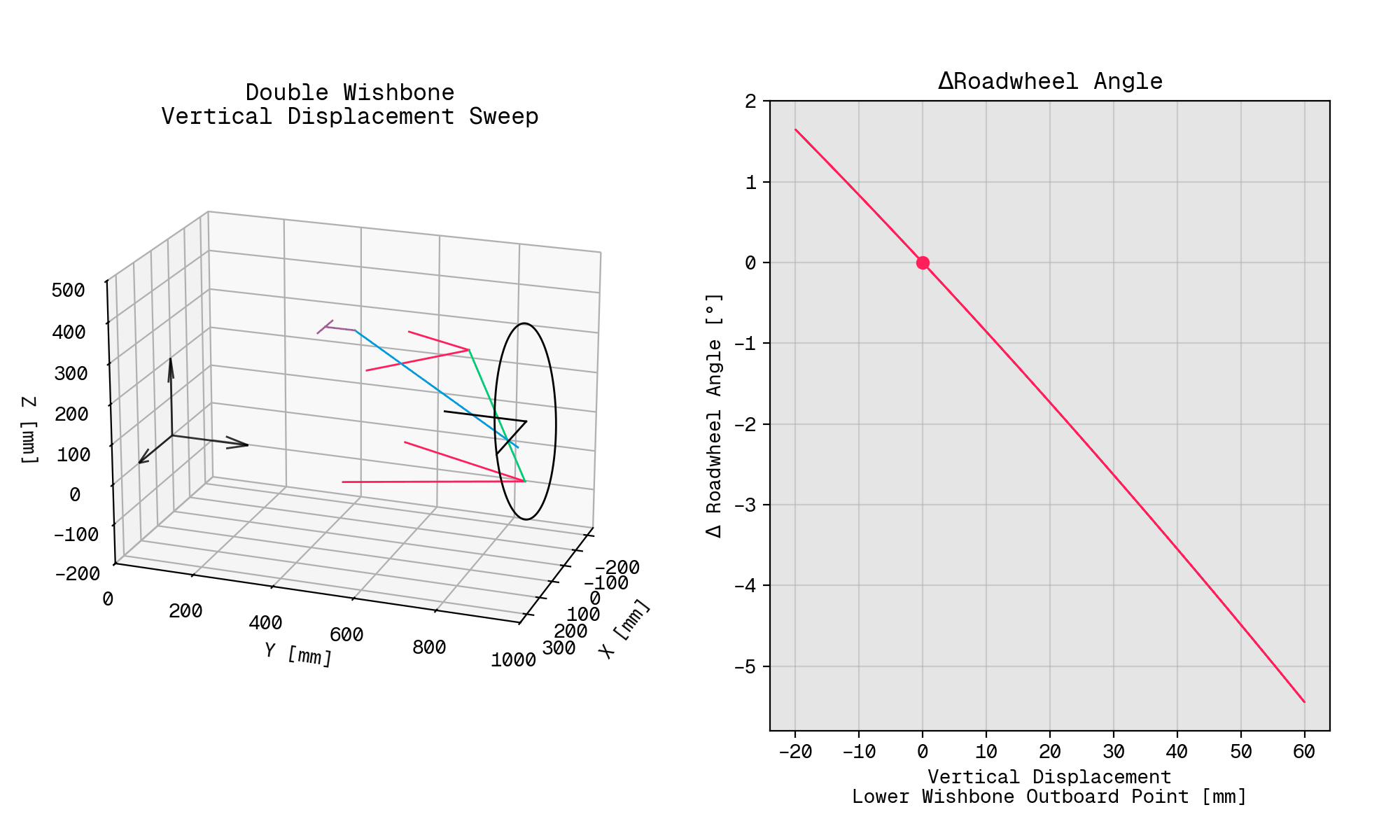 †What I mean by flexibility here is really having the ability to drive the simulation based on a selection of parameters. Maybe you want to solve for all of the positions in the system at a given wheel centre Z height, but maybe you want a given lower balljoint position, or upper balljoint position. With an analytical approach, you would need different equations with different subject terms to achieve this. Practically, I suspect you would probably end up building one solution path then reinterpolating it onto your desired breakpoints when you wanted something else… which feels like it violates the analytical purity.