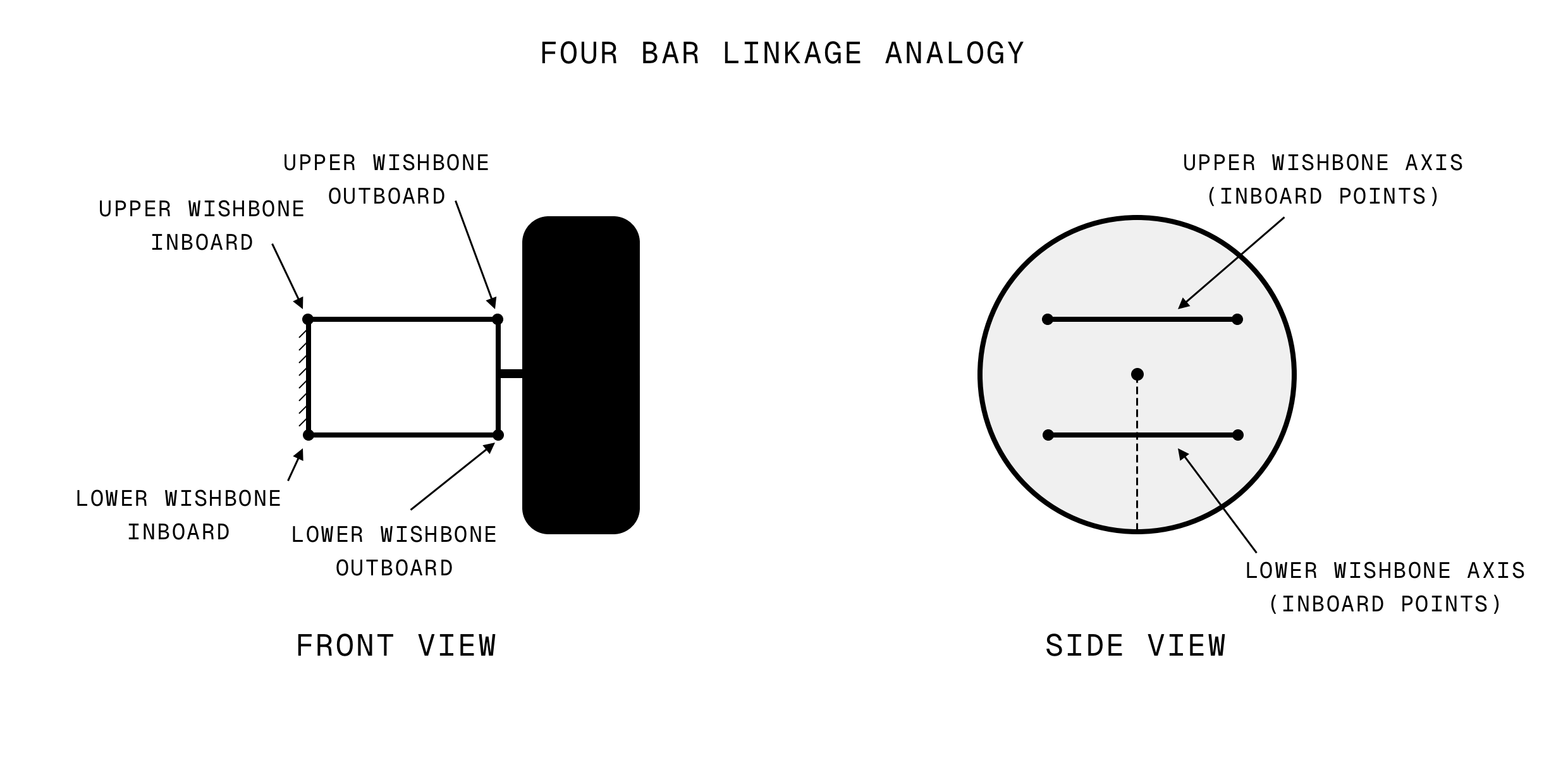 - Wishbone inboard points $A$, $B$, $C$, and $D$ are all fixed to the chassis.