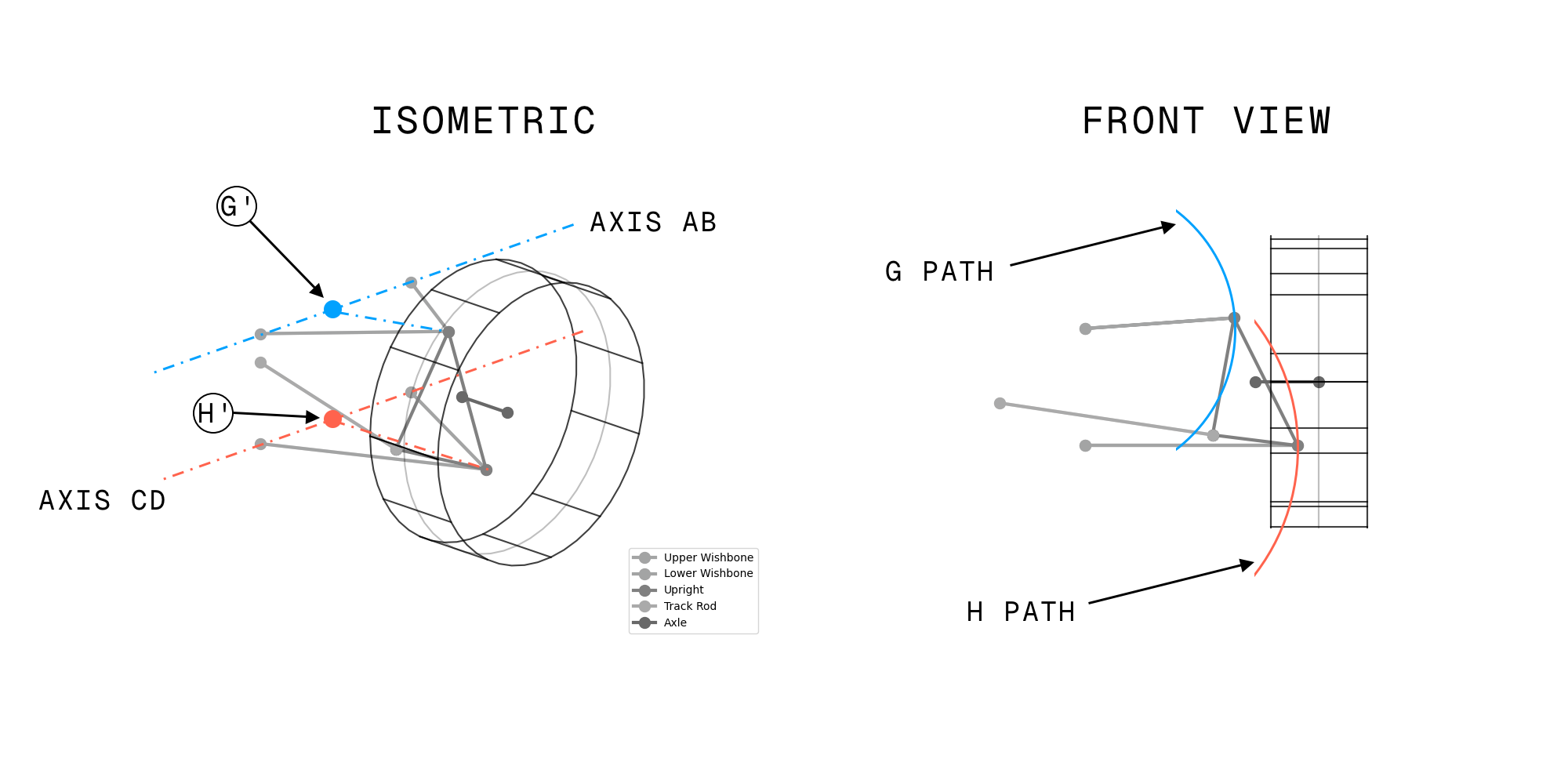 - Similarly, the path followed by the lower wishbone outboard point, $H$, traces a circular arc across a plane that is perpendicular to the axis $\vec{CD}$ and which passes through $H$. The arc’s centre point, $H^\prime$, lies on the vector $\vec{CD}$, and its radius is the distance from $H$ to $\vec{CD}$.