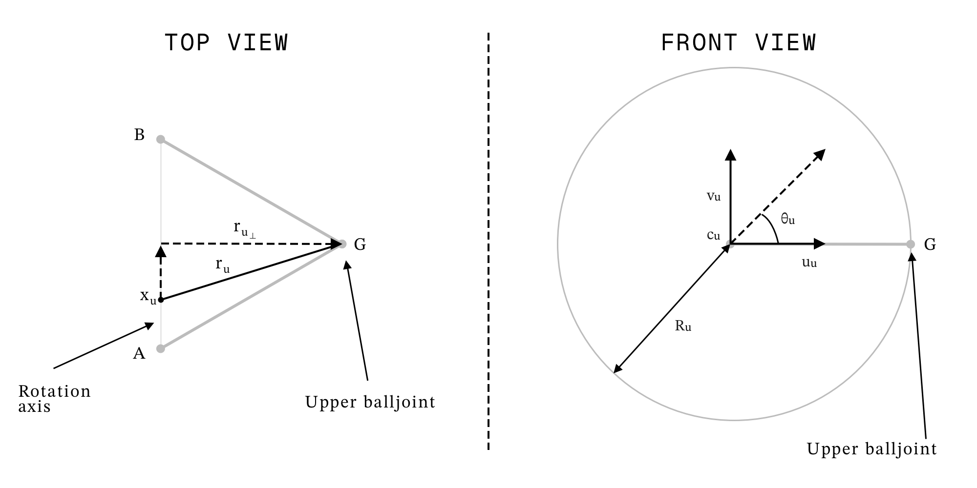 - $R_u$: distance from upper wishbone rotation axis to outboard point, $\lvert\vec{G^\prime G}\rvert$.