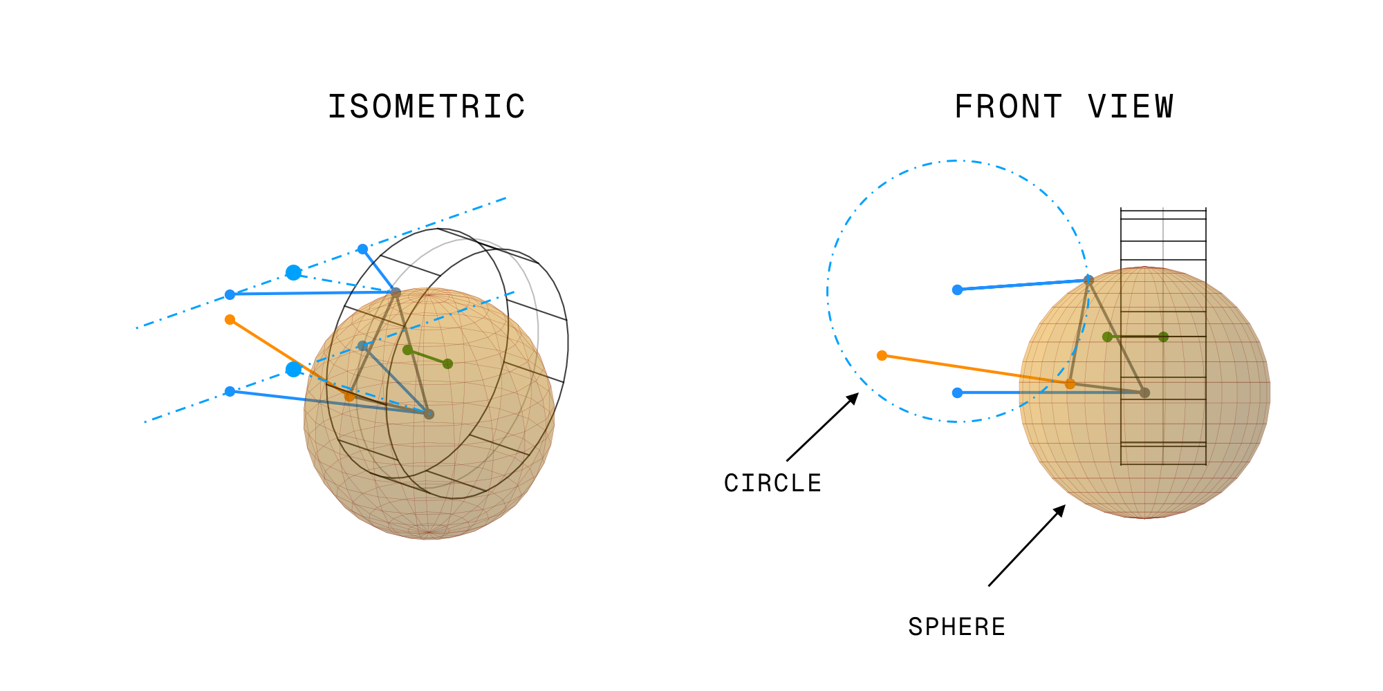 - The kingpin axis has one point fixed at the known balljoint position, but its other extreme could lie at any point on a sphere of radius $L_{kp}$ whose centre lies at the known balljoint position.